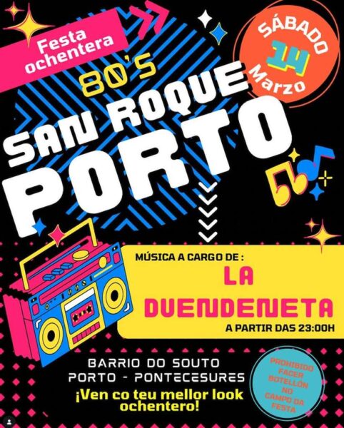Pontecesures se prepara para viajar en el tiempo el próximo sábado 14 de Marzo. El Barrio do Souto de Porto se convertirá en el epicentro de la nostalgia con la celebración de una Festa Ochentera, un evento diseñado para los amantes de la década dorada. La noche promete ritmo ininterrumpido con La Duendeneta, encargada de poner la banda sonora al evento. La música comenzará a sonar a partir de las 23:00 h, rescatando los mejores éxitos que marcaron a toda una generación.