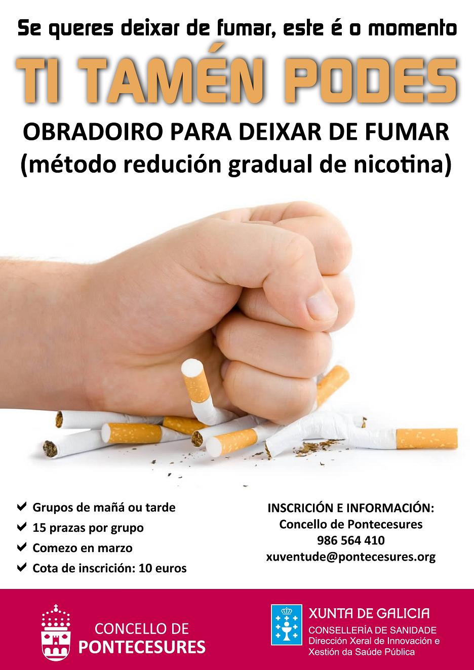 En un momento en que los vaporizadores se han puesto de moda, evidenciando el deseo de muchos fumadores por dejar atrás el humo, Catoira y Pontecesures recuperan los métodos más tradicionales de lucha contra el tabaco. Los talleres qkue impartirán a partir del mes de mayo en ambas localidades tendrán horario de mañana o de tarde “en función da demanda. “Por dez euros (precio que cuesta la matrícula) los participantes recibirán un tratamiento que consistirá, básicamente, en una “reducción gradual da nicotina”. Ir trabajando la dosis de forma paulatina “permite controlar a dependencia física e psicolóxica que provoca o tabaquismo sen sufrir ningún síntoma do síndrome de abstinencia que provoca a adicción”. Las sesiones de trabajo serán semanales durante el primer mes. Después se espaciarán durante quince días durante dos meses más.